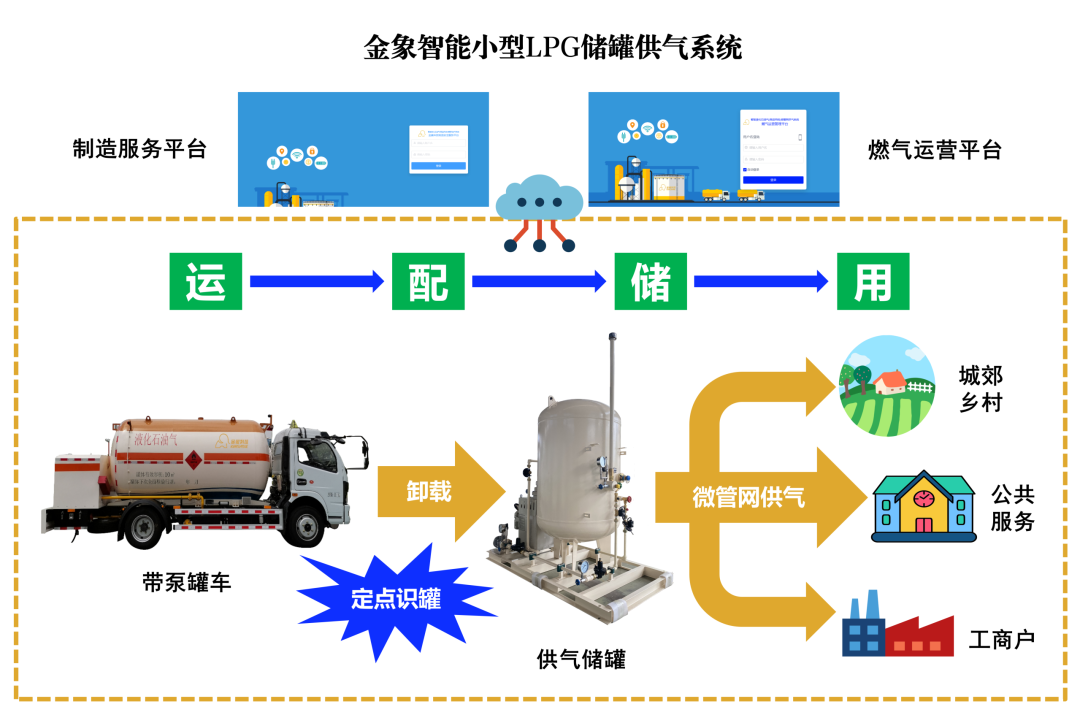 金象智能LPG储罐系统以“本质安全”为核心理念,集防泄漏、超压保护、防过量充装等主动与被动防护机制于一体,具备灵活部署、智能管理、高效供气与环保节能等突出优势。系统通过智能硬件、数字平台与创新运营模式协同运作,构建覆盖“运-配-储-用”全流程的智能管控体系,实现从气源到终端用户的无人值守、智能配送与远程监控,切实解决了燃气管网难以覆盖区域的用气难题。