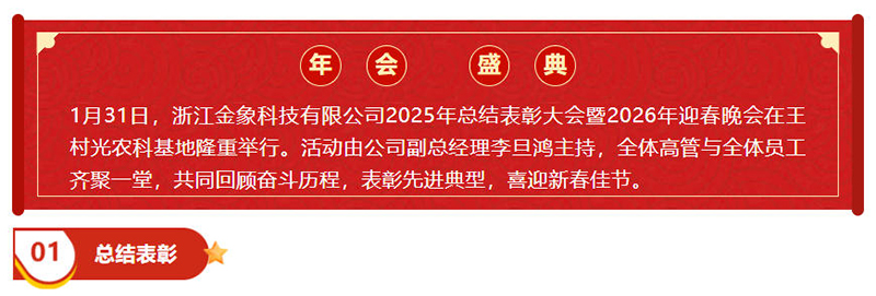 员工代表吴赛波、郭赛楠、史大伟依次上台,结合自身经历,畅谈成长感悟、共话奋斗决心,真诚而有力的发言引发了广泛共鸣。总经理王建中在总结中,再次向所有获奖者致以热烈祝贺,并向全体员工一年来的辛勤付出表示衷心感谢,并提前致以新春的问候。他号召全体金象人在新征程上携手并肩、勇攀高峰。典礼最后,全体总监会议成员合影留念,将奋斗的荣光与团队的信念永恒定格。晚会节目好戏连台、精彩不断:舞蹈《再唱山歌给党听》舞姿翩跹、深情动人;合唱《咱们工人有力量》唱出铿锵斗志;《马年style》引爆全场活力,《鸳鸯戏》尽显婉约之美;《红马鞍》对唱甜蜜温馨,《登高》歌声昂扬向上。更有来自日、韩的嘉宾倾情献唱,《苹果丰收》、《心上的罗加》等节目轮番上演,掌声与喝彩此起最终,盛典在温情洋溢的全场合唱中圆满落下帷幕。这不仅是一场表彰先进、鼓舞士气的盛会,更是一次凝聚人心、展现风采的庆典。迈向2026,金象科技将继续秉承“求实创新、追求卓越”的价值观,与全体员工同心同行,在时代浪潮中奋楫扬帆,共创共赢未来!